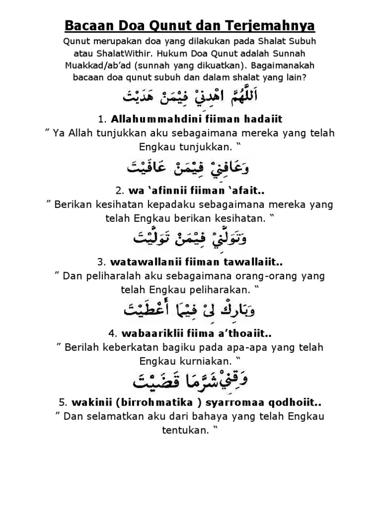 Doa qunut subuh merupakan amalan sunnah yang dilakukan setelah ruku' atau i'tidal. Kamu pasti tidak asing dengan doa qunut. Demikian pembahasan tentang doa qunut subuh dan qunut witir. Doa qunut subuh dibacakan setelah salat subuh, menurut imam nawawi hukum membaca doa qunut setelah salat subuh adalah sunnah muakkadah atau sangat dianjurkan. Qunut witir merupakan doa yang dibaca pada rakaat terakhir shalat witir.
